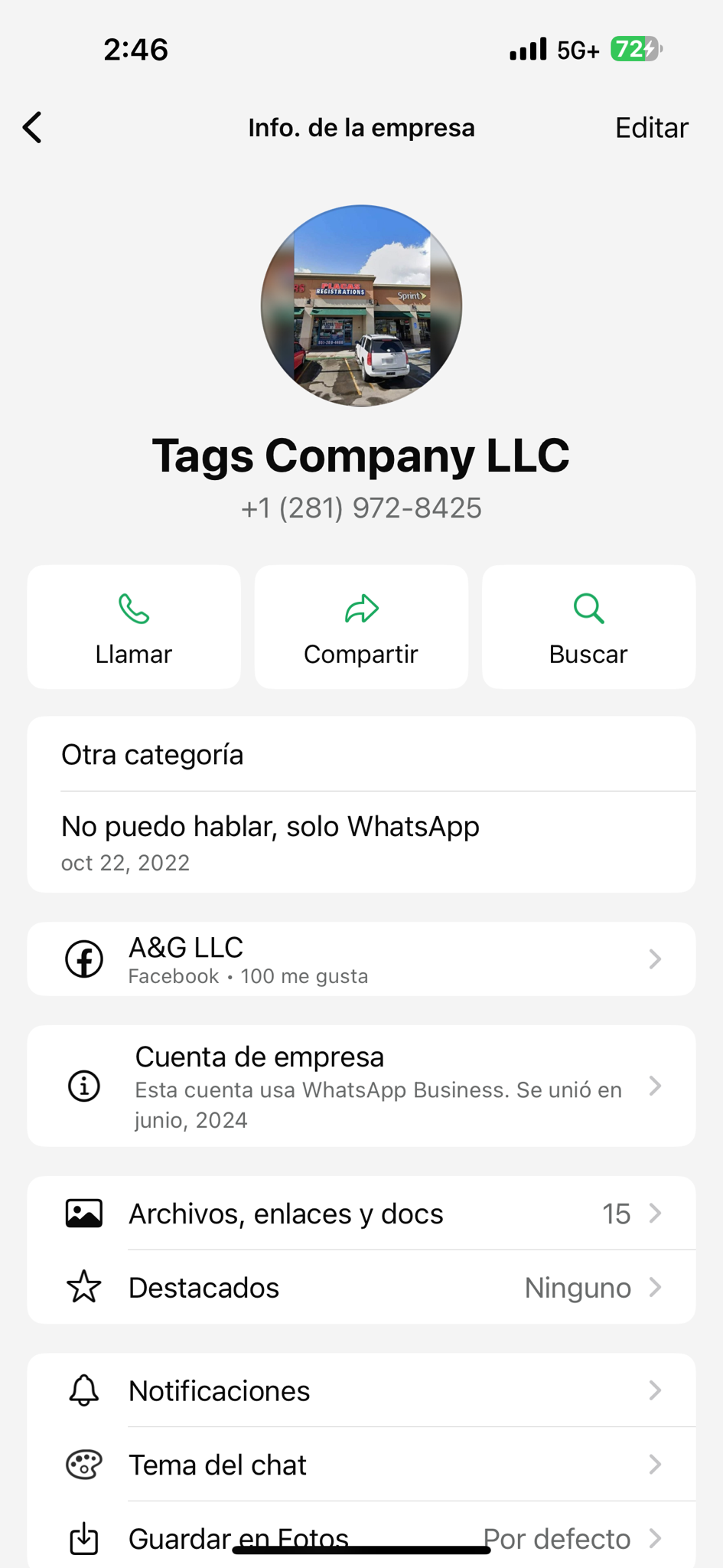 Este número de WhatsApp usa imágenes de nuestras oficinas para engañar a clientes y vender seguros de auto falsos.